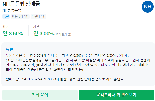 2024년 9월 네이버 기준 농협은행 정기예금별 금리가 높은순으로 작성하였습니다.