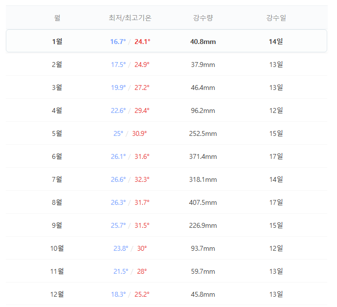 대만 가오슝 시차 날씨 정보 (1월~12월)