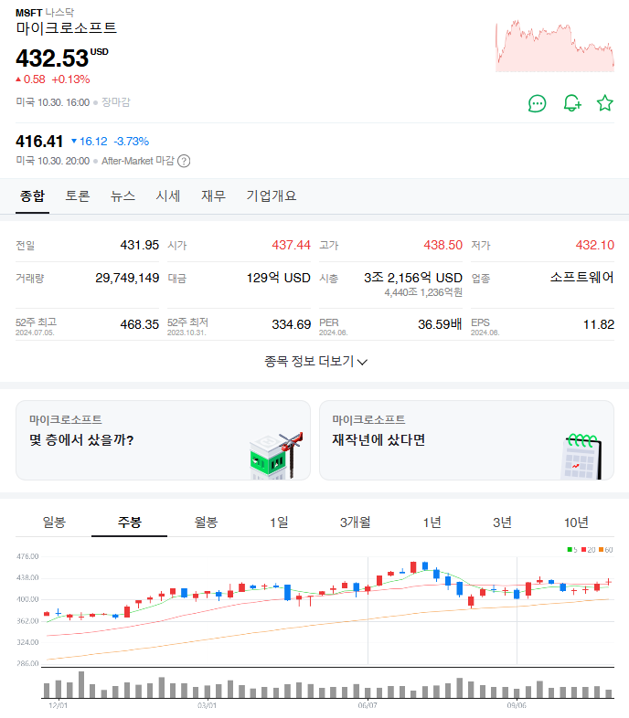 최근 마이크로소프트의 주가는 432.53달러로, 지난 몇 달간의 상승세를 이어가고 있습니다. 특히, 2024년 4월에는 420달러에서 시작하여, 연말까지 559달러에 도달할 것으로 예상되고 있습니다. 이는 약 34.4%의 성장을 의미하며, 많은 투자자들이 긍정적인 전망을 하고 있습니다. 이러한 주가 상승은 클라우드 서비스의 성장과 함께 인공지능(AI) 기술의 발전이 큰 영향을 미치고 있습니다.