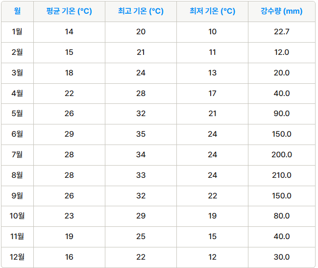 하노이는 열대 몬순 기후에 속하며, 연중 기온과 강수량의 변화가 뚜렷합니다. 여름은 덥고 습하며, 겨울은 비교적 건조하고 쌀쌀합니다. 이러한 기후 특성은 여행 계획에 큰 영향을 미칠 수 있습니다.