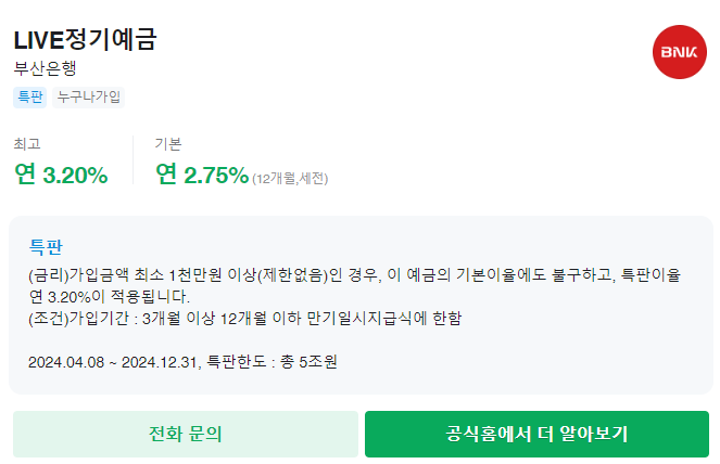 2024년 9월 네이버 기준 부산은행 정기예금별 금리가 높은순으로 작성하였습니다.