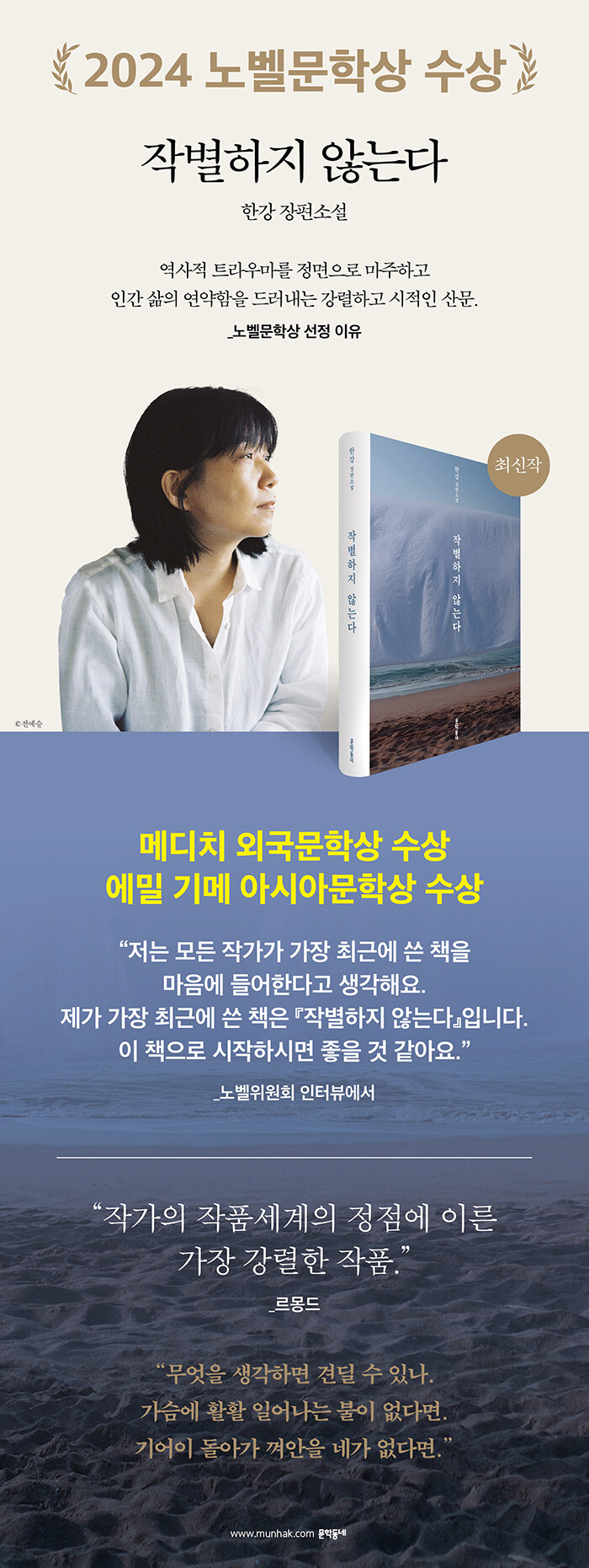 한강의 최근 작품들인 『소년이 온다』(2014), 『흰』(2016), 그리고 ‘눈’ 연작(2015, 2017)을 통해, 어둠 속에서도 한 줄기 빛을 향해 나아가는 인간의 고투와 존엄이 그려졌습니다. 이번 작품은 비극적 역사의 기억을 바탕으로 하면서도, 인간을 인간답게 만드는 간절하고 지극한 사랑의 이야기를 담고 있습니다.