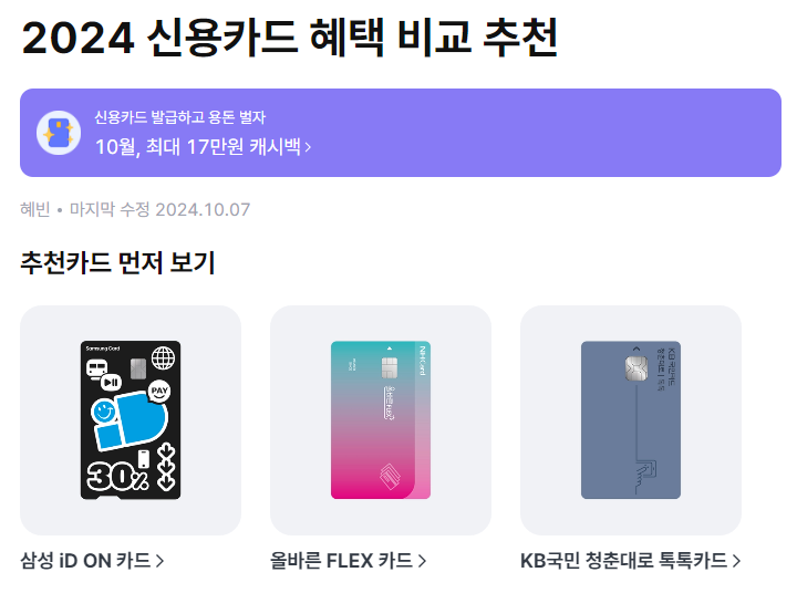 | 2024 혜택 좋은 신용카드 TOP 3 (5) | 2024.10.23 |