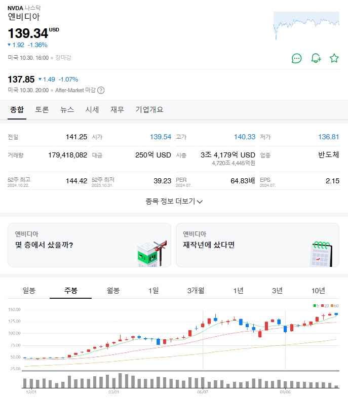 최근 엔비디아의 주가는 139.34달러로, 지난 몇 주간의 변동성을 보였습니다. 주가는 140.93달러에서 시작하여 최고 144.13달러까지 상승한 후, 다시 하락세를 보였습니다. 이러한 변동은 시장의 전반적인 불안정성과 함께 엔비디아의 실적 발표와 관련된 뉴스에 크게 영향을 받았습니다. 특히, AI와 관련된 기술의 발전이 주가에 긍정적인 영향을 미치고 있습니다.