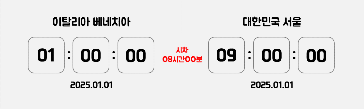 베네치아는 중앙유럽 표준시(CET, UTC+1)를 따릅니다. 따라서 대한민국 서울이 오전 9시일 때, 베네치아는 오전 1시가 됩니다. 여름철에는 서머타임이 적용되어 UTC+2로 변경되므로, 이 경우 서울이 오전 9시일 때 베네치아는 오전 2시가 됩니다. 여행 계획을 세울 때 이 시차를 고려하는 것이 중요합니다.