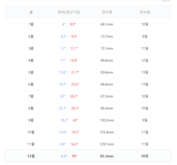 | 이탈리아 밀라노 날씨 시차 정보 (1월~12월) (1) | 2024.12.28 |