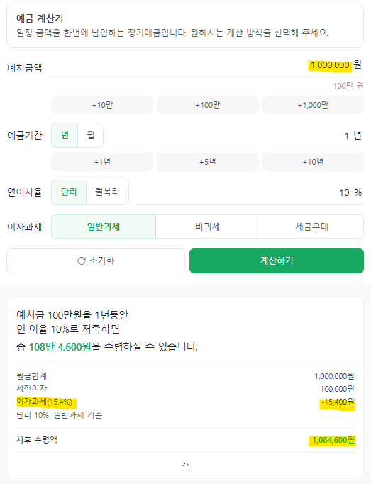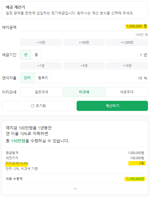 조건은 모두 동일합니다. 예치금 100만원을 1년동안 연 이율 10%로 저축한 조건입니다.
