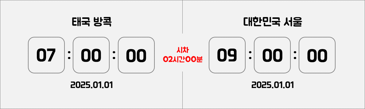 대한민국 서울과 방콕의 시차는 2시간입니다. 즉, 서울이 오전 9시일 때 방콕은 오전 7시입니다. 방콕은 한국보다 2시간 느리기 때문에, 여행을 떠나기 전에 시차 적응을 고려해야 합니다. 특히 장시간 비행 후 도착하면 피로감이 클 수 있으니, 도착 후에는 충분한 휴식을 취하는 것이 좋습니다.