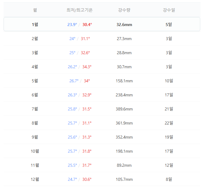 | 대만 가오슝 시차 날씨 정보 (1월~12월) (1) | 2025.01.18 |