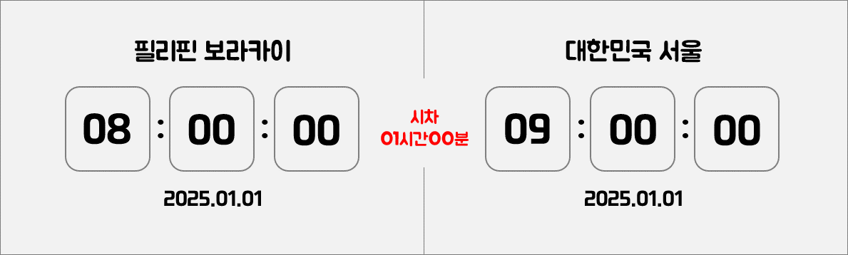 보라카이의 시차는 한국보다 1시간 느립니다. 즉, 대한민국 서울에서 오전 9시일 때, 보라카이는 오전 8시가 됩니다. 이로 인해 여행 계획을 세울 때 시차를 고려해야 합니다. 예를 들어, 한국에서 오전 9시에 출발하면 보라카이에 도착했을 때는 오전 8시가 되어, 여행 첫날을 더 길게 활용할 수 있습니다.