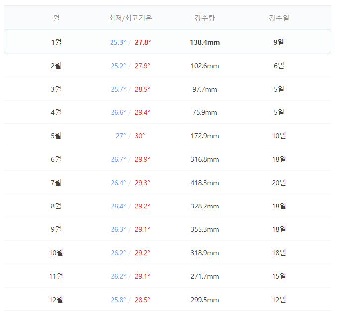 | 대만 가오슝 시차 날씨 정보 (1월~12월) (1) | 2025.01.18 |