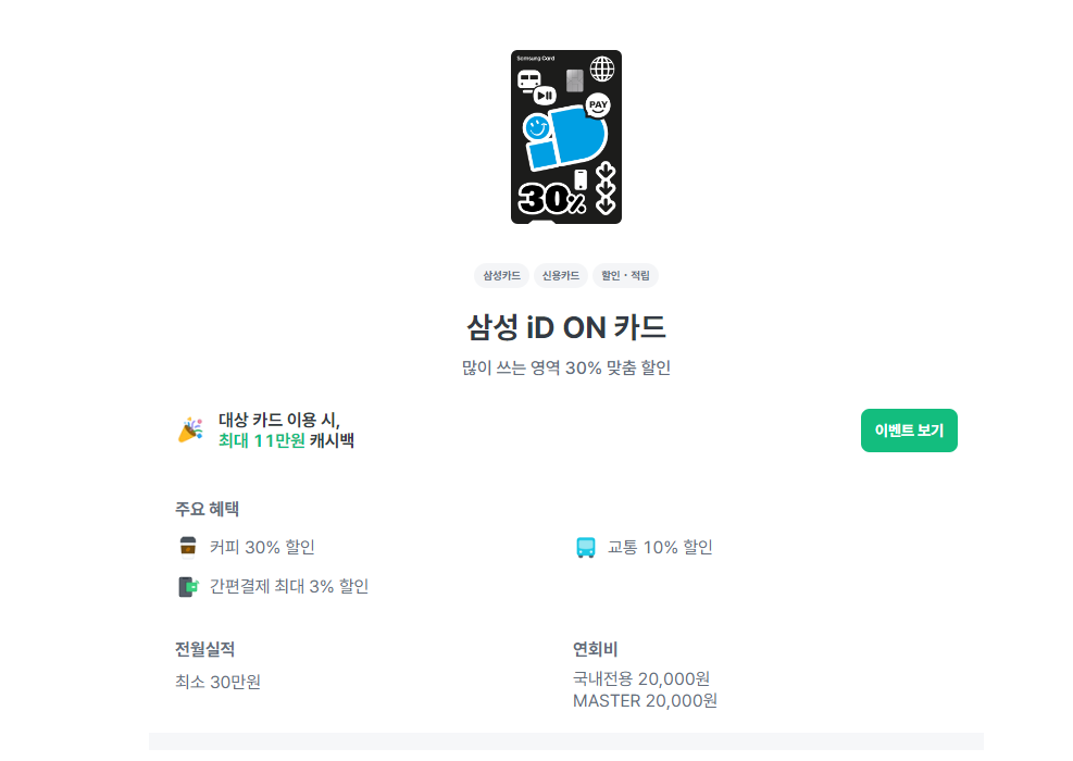 - 카페, 배달, 디저트: 30% 할인 (최대 10,000원)