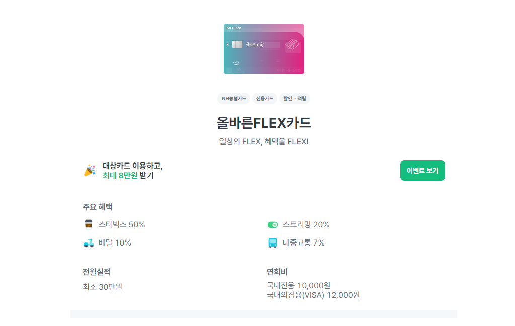 농협 올바른 FLEX 카드는 연회비와 전월 실적 조건이 낮으면서도 높은 할인 혜택을 제공합니다. 다양한 일상 영역에서 할인 혜택을 제공하여 2030 사회초년생에게 적합한 카드입니다.