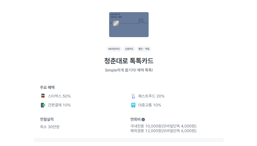 KB국민 청춘대로 톡톡 카드는 사회초년생을 위해 스타벅스, 패스트푸드, 대중교통 등에서 할인 혜택을 제공합니다. 특히 스타벅스에서 50% 할인과 패스트푸드에서 20% 할인을 받을 수 있습니다.